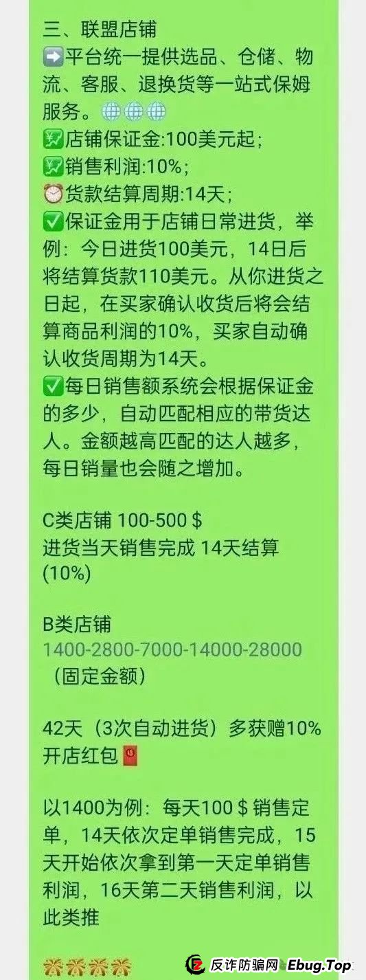 还有它的全托管店铺模式,用户投入300 - 20000美金进货,平台代运营。听起来省心省力,可利润从哪来呢?商品销售数据从不公开,无法确认交易记录是否真实,很可能就是用新用户的本金来支付老用户的“收益”,典型的庞氏骗局套路,一旦没有足够的新用户加入,资金链断裂,整个盘子就会瞬间崩塌。